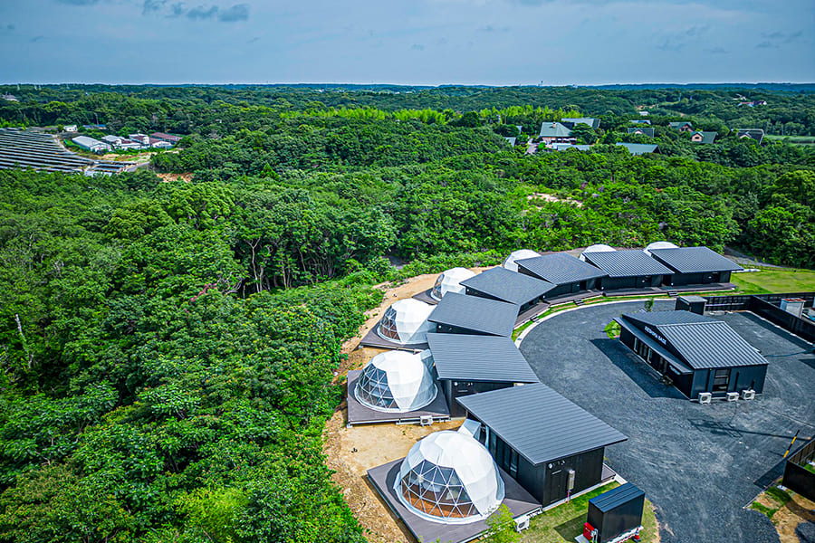 2019年にリニューアルオープンしたGLAMP DOME 伊勢賢島は、伊勢志摩の海と山に囲まれた大自然の中で楽しむグランピング施設です。