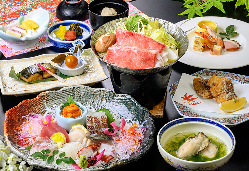 松坂牛・伊賀牛・三重いなべ牛を食べ比べて楽しむプランや、松坂牛の鉄板焼きと伊勢海老の黄金焼きを一緒に食べられる山海グルメ会席、伊勢海老・松阪牛・鮑が共演する丸ごとしゃぶしゃぶなどのコースや一品料理が数多くございます。